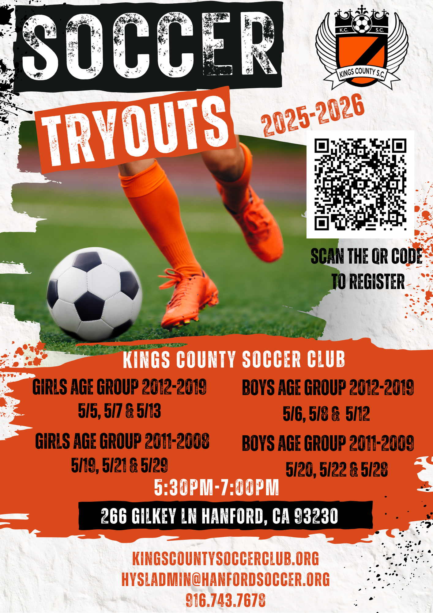 Kings County Soccer Club was founded in 2014 and is partnered with Hanford Youth Soccer League which was established in 1982. Our mission is to foster a culture of excellence both on and off the field. Through the beautiful game of soccer, we strive to instill the values of good sportsmanship, academic achievement, leadership, and character development in our players. By providing a supportive environment that emphasizes teamwork, integrity, and personal growth, we aim to empower our athletes to become champions not only in soccer but in life. Together, we inspire greatness, cultivate leadership, and shape the future leaders of our community.